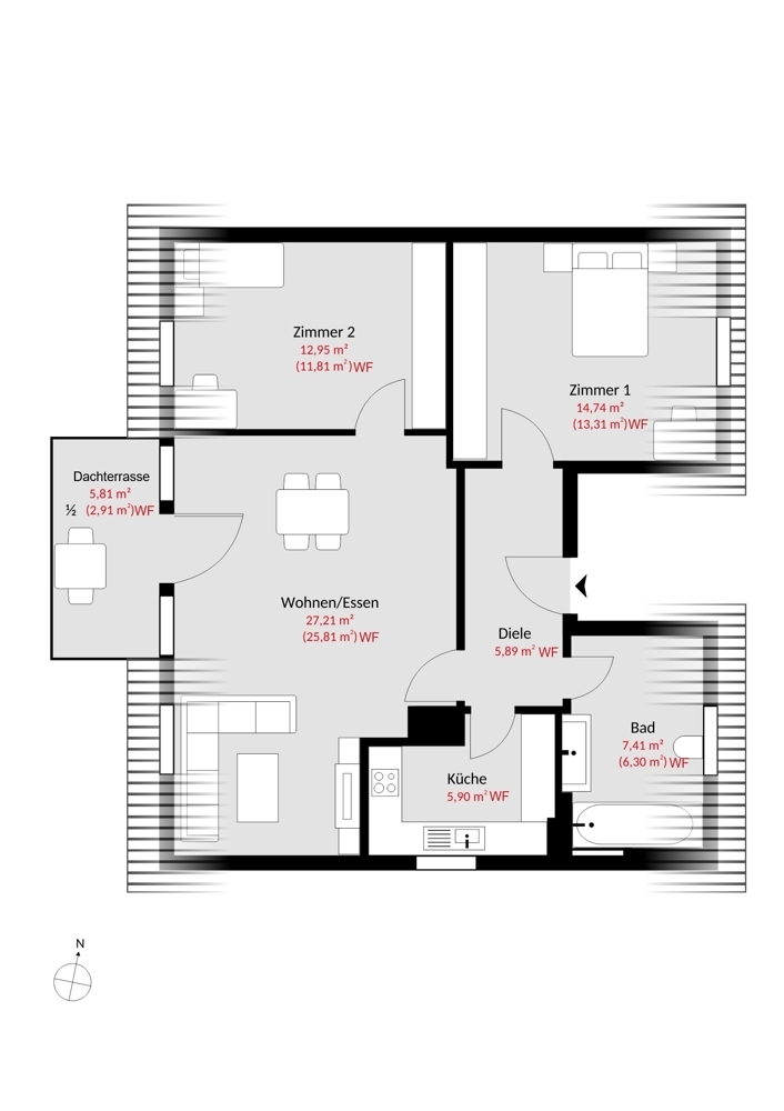 • Geräumiger Wohn-/Essbereich mit Zugang zur Dachterrasse