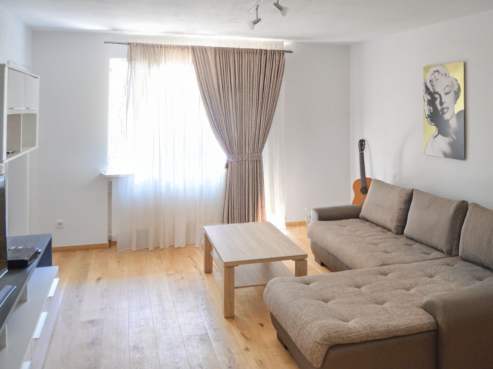 • Helles Wohnzimmer mit Zugang zum Schlafzimmer und zur Gartenterrasse