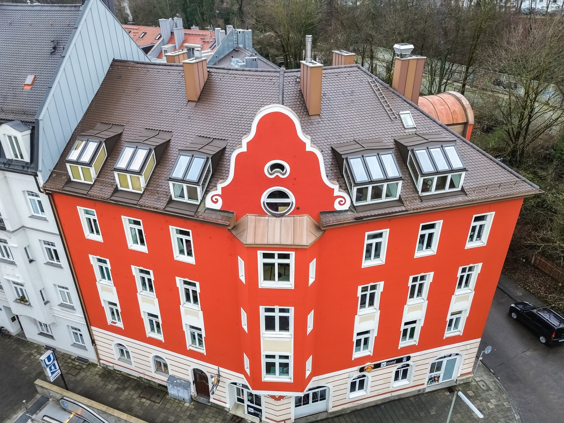 Repräsentatives Altbauensemble mit geräumigen Wohnungen in den oberen Etagen des Hauses und einem Restaurant im Erdgeschoss. Die historische Rarität wurde im Jahr 1900 errichtet, seitdem regelmäßig renoviert und besticht durch die elegante Fassadengestaltung mit imposantem Dacherker. Das stilvolle Treppenhaus ist mit nostalgischen Elementen wie Holzstufen, schmiedeeisernem Geländer, Deckenstuck und dekorativen Bodenfliesen ausgestattet und zeugt so noch heute von der langen Geschichte des Gebäudes.