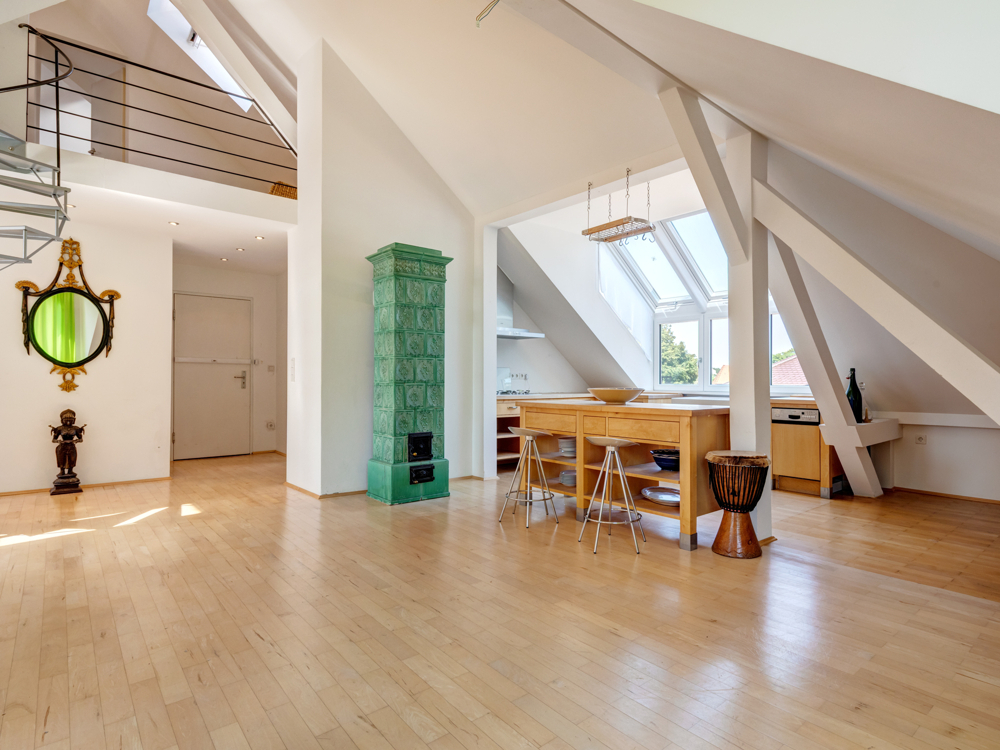 Einzigartige Dachgeschosswohnung mit ca. 197 m² Wohn-/Nutzfläche und individueller 3-Zimmer-Aufteilung zzgl. einer nutzbaren Galerieebene sowie einem kleinen Apartment. Hohe Decken und große Dachflächenfenster schaffen ein offenes, großzügiges Raumgefühl, während sichtbare Dachbalken und drei Kaminöfen für eine warme, gemütliche Atmosphäre sorgen. Über eine geschwungene Wendeltreppe ist die Galeriefläche zu erreichen, diese lässt sich vielseitig nutzen und bietet Ausblick in den großen Wohnraum. Der verglaste Wintergarten in Westausrichtung lädt zum Genießen vieler Sonnenstunden ein und strahlt ein erholsames Dachterrassenflair aus.
