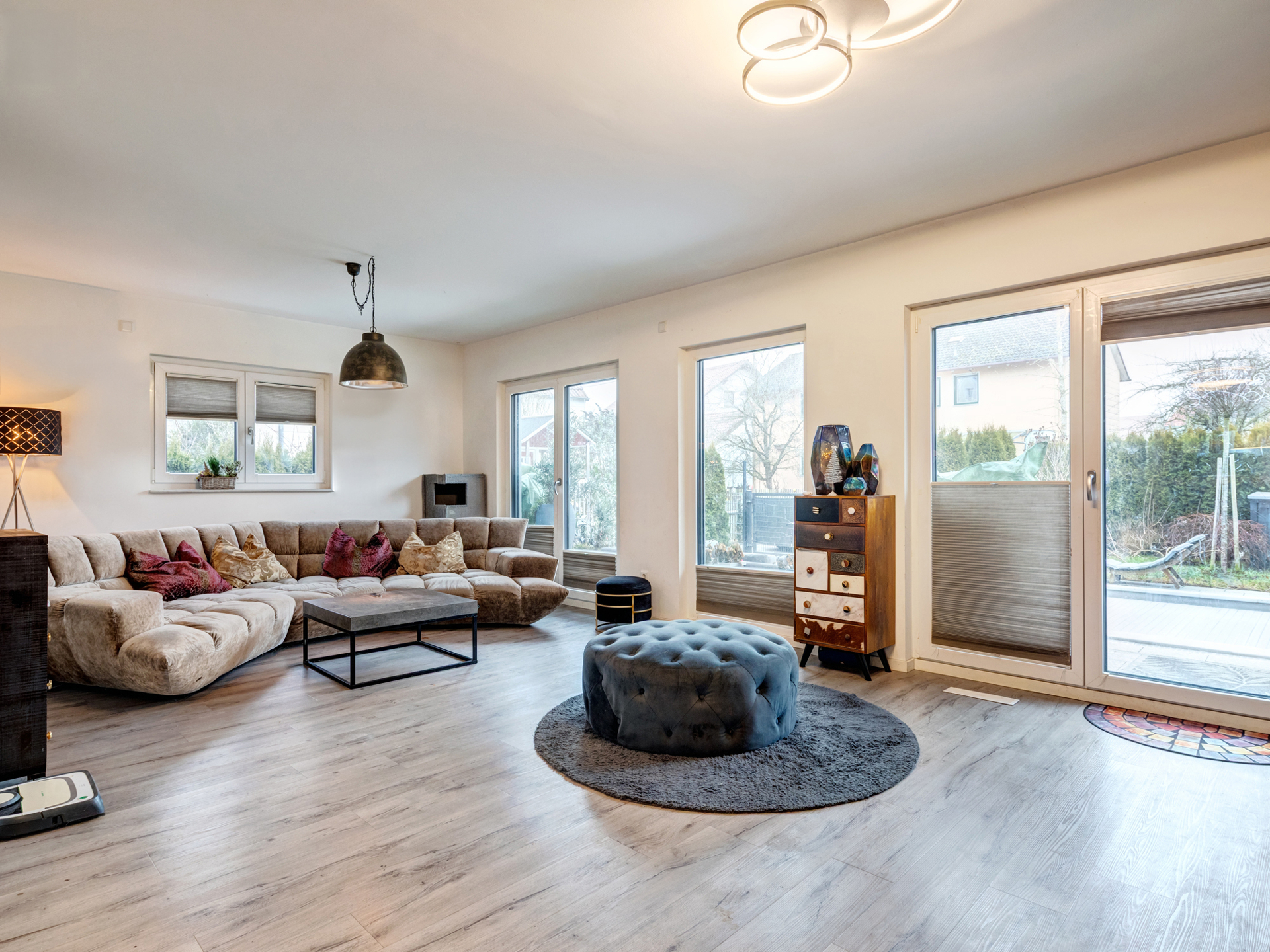 • Großes Wohn-/Esszimmer mit bodentiefen Fenstefronten und Zugang zum Garten