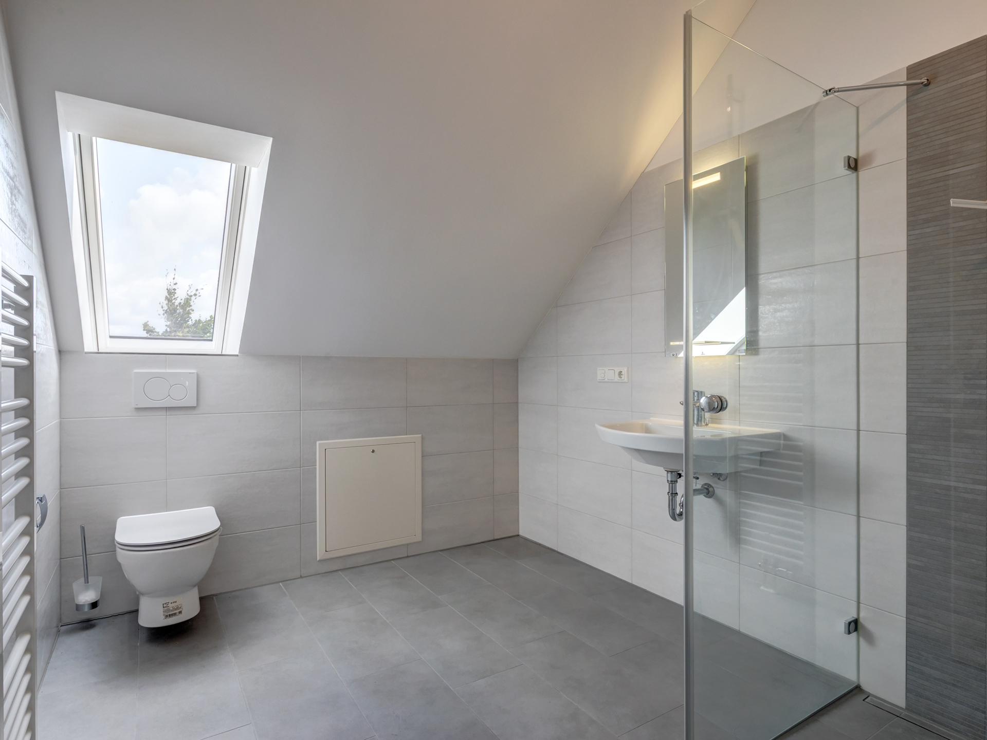 • Badezimmer mit ebenerdiger Dusche und Dachfenster